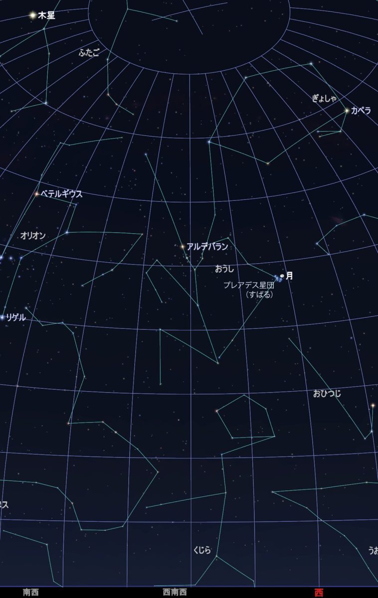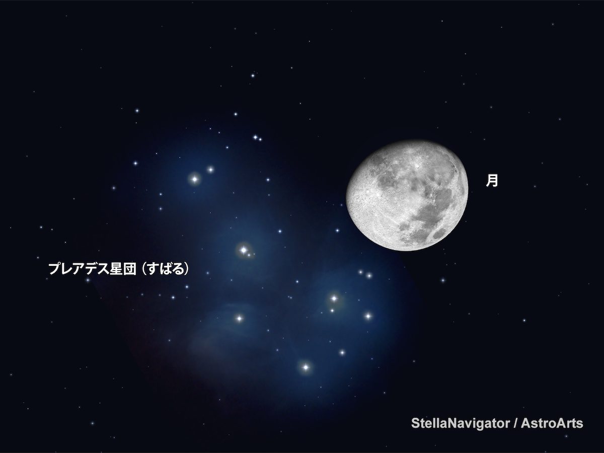 地域によって時間帯は異なりますが、東京では、23時頃に月がプレアデス星団の北側の星を隠し始めます。食の終わりは年を越して1月1日の1時頃です。