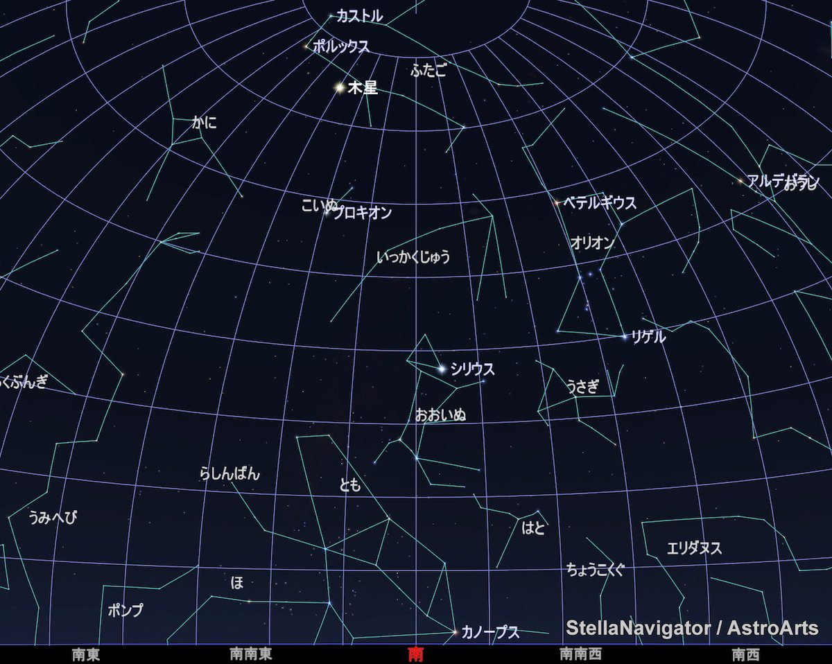 プレアデス星団の食が始まる大晦日23時頃には、おうし座をはじめ、オリオン座、シリウスのあるおおいぬ座など冬の星座たちが雄大な姿を見せています。実はこの時間帯、南の空にあるりゅうこつ座のカノープスを見るチャンスでもあります。