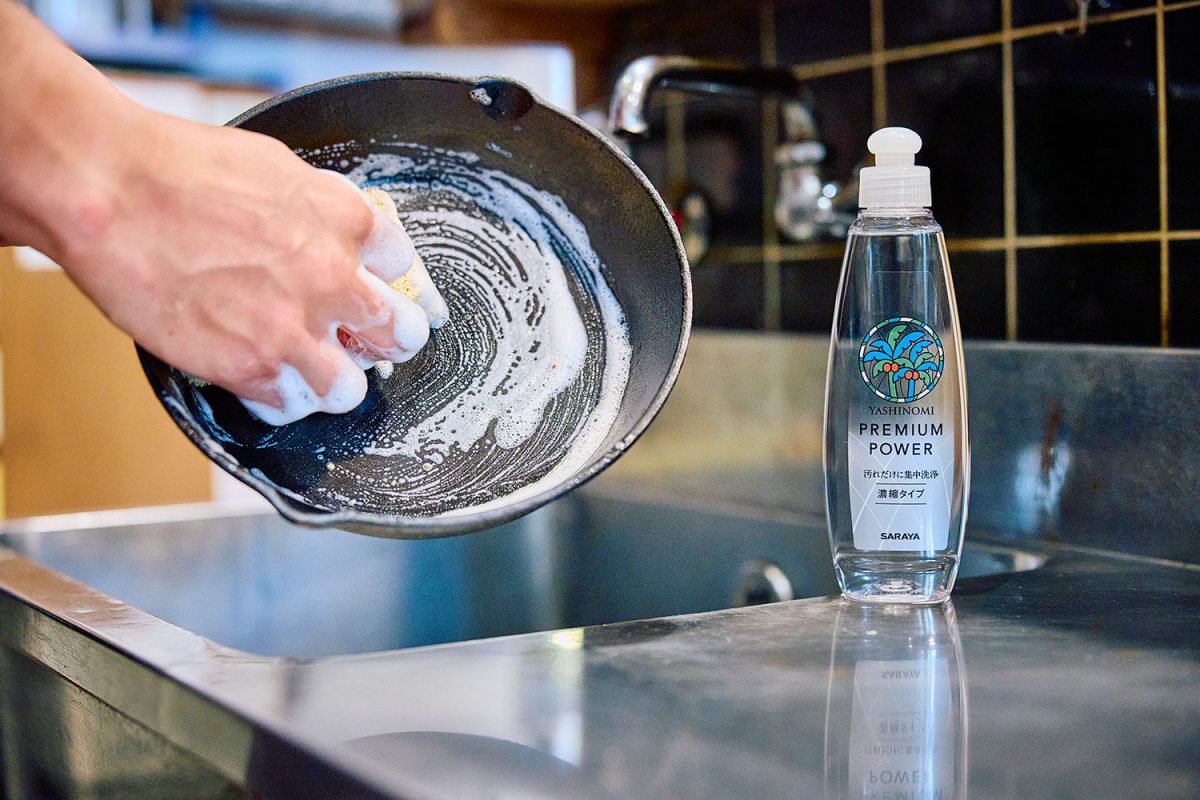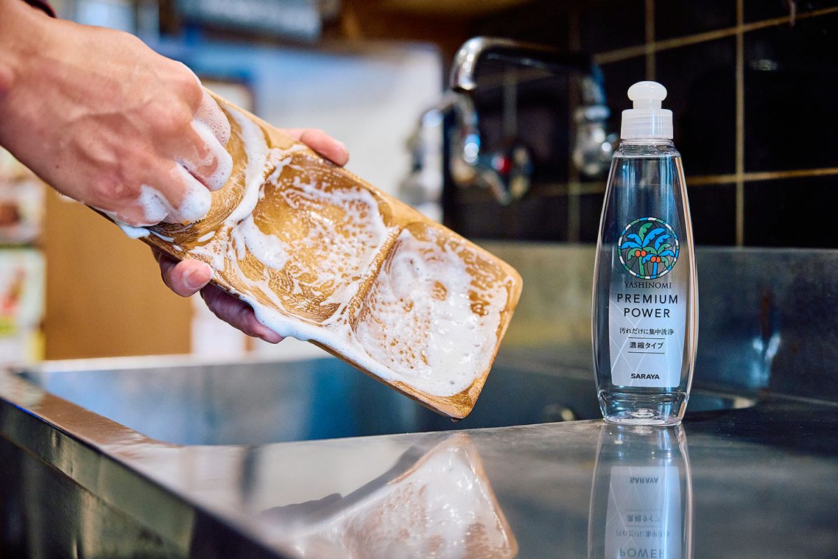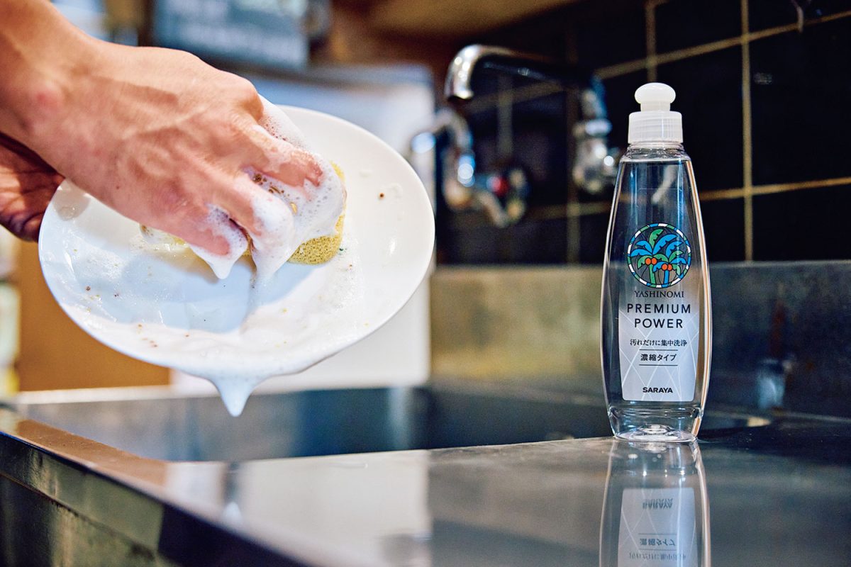 ところが、「ヤシノミ洗剤」なら、ヤシの実由来の植物性洗浄成分を使用しているので、排水は微生物が素早く分解してくれる。これならキャンプでもOKと、愛用するように。もちろん、お店でも大活躍!