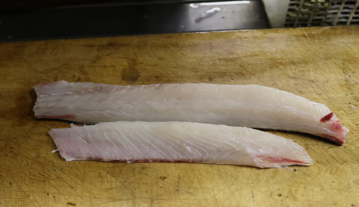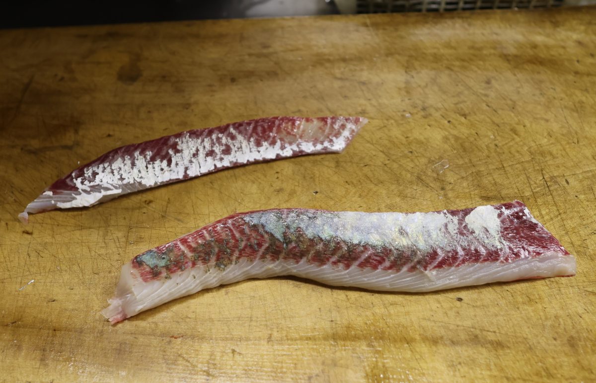 柵取りされたボラの背側。血合いの赤が鮮やかだ。(愛知県海部郡蟹江町「湯元館」にて)