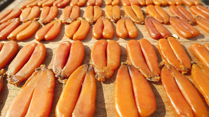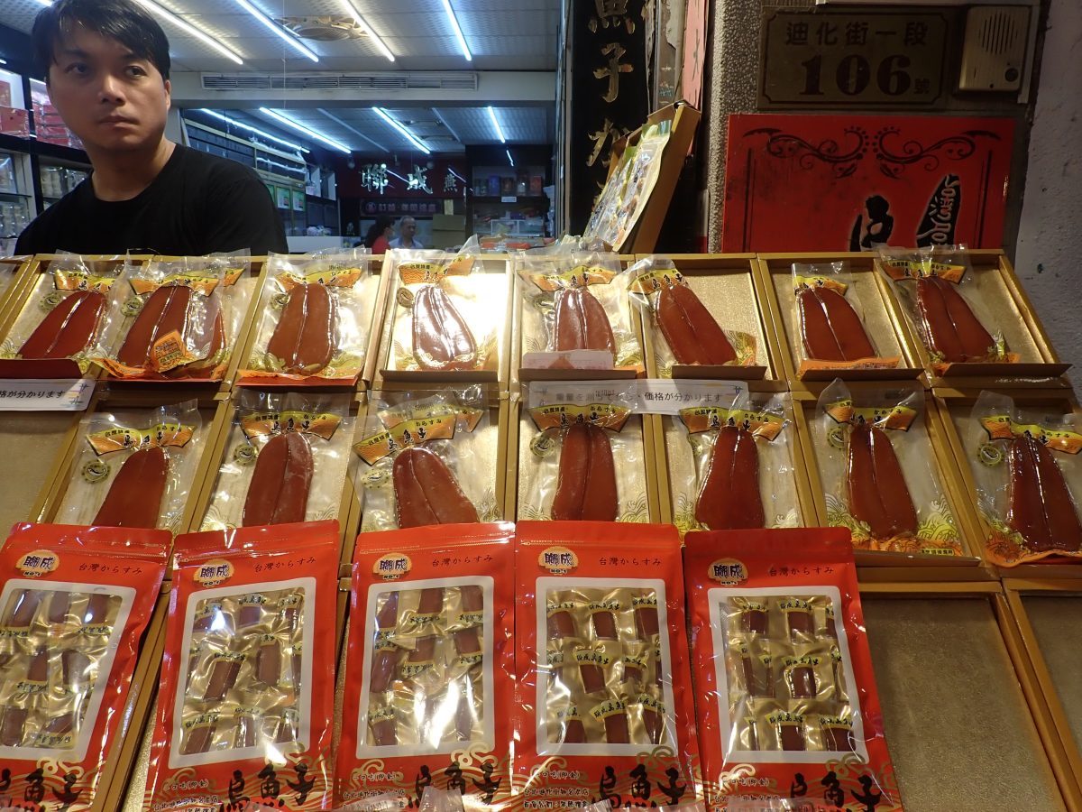 ボラの卵巣を塩漬けにして、そのあと塩抜きをして天日に干してつくるカラスミは、ウニやコノワタ(ナマコの内臓を塩辛にしたもの)と並んで日本三大珍味とされる。台湾でも、高級な乾物としてカラスミの専門店が多く並んでいる。