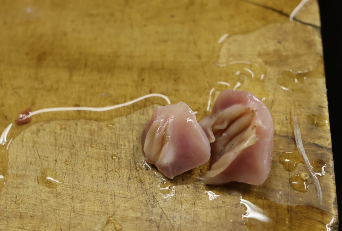ボラの胃の幽門部「ボラのへそ」。包丁で真っ二つに切れている。(愛知県海部郡蟹江町「湯元館」にて)