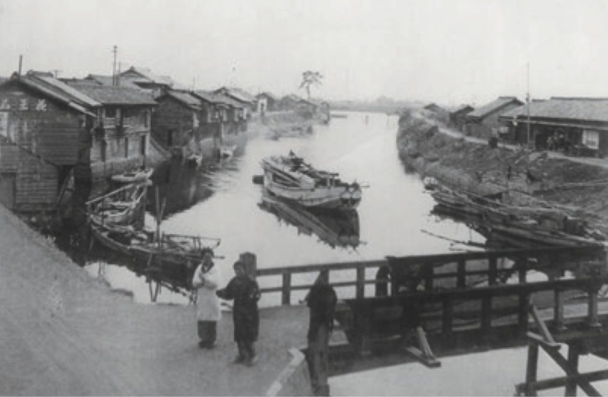 愛知県海部郡蟹江町は川漁、舟運が盛んだった。戦前の写真からは、家が堤防の川側にあり、暮らしと川、舟が近かったことがわかる。蟹江町の広報誌『まちから』(No.576)より。