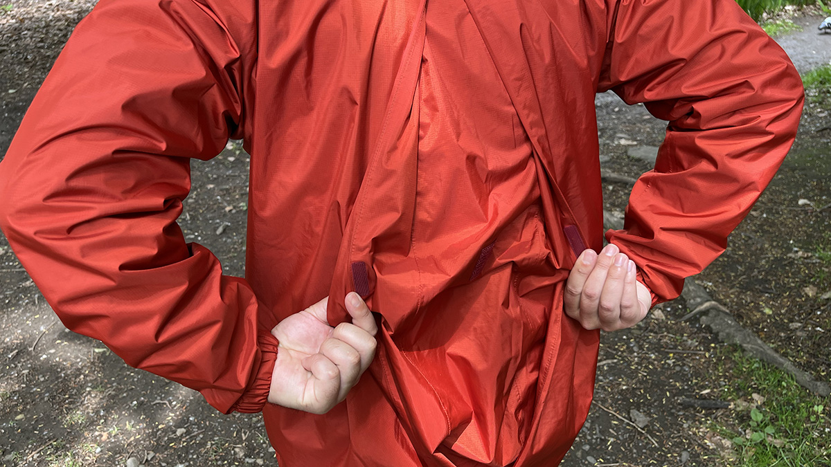 実際に、バッグを背負った上からパックラップ レインジャケットを着てみた。背負っていない状態だと、前面の裾と背面と裾とで長さが異なることがわかる。