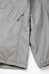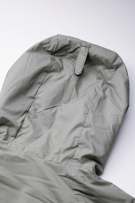 素材は、ストレッチ性を持つ15デニールという極薄のナイロン・リップストップ地「バリスティック エアライト」。軽くてコンパクトながら強度にも優れ、サラッとした肌触りの素材だ。フードには調節用ベルクロストラップが付き、ポケット内のコードを引くと裾のフィット調節ができる。