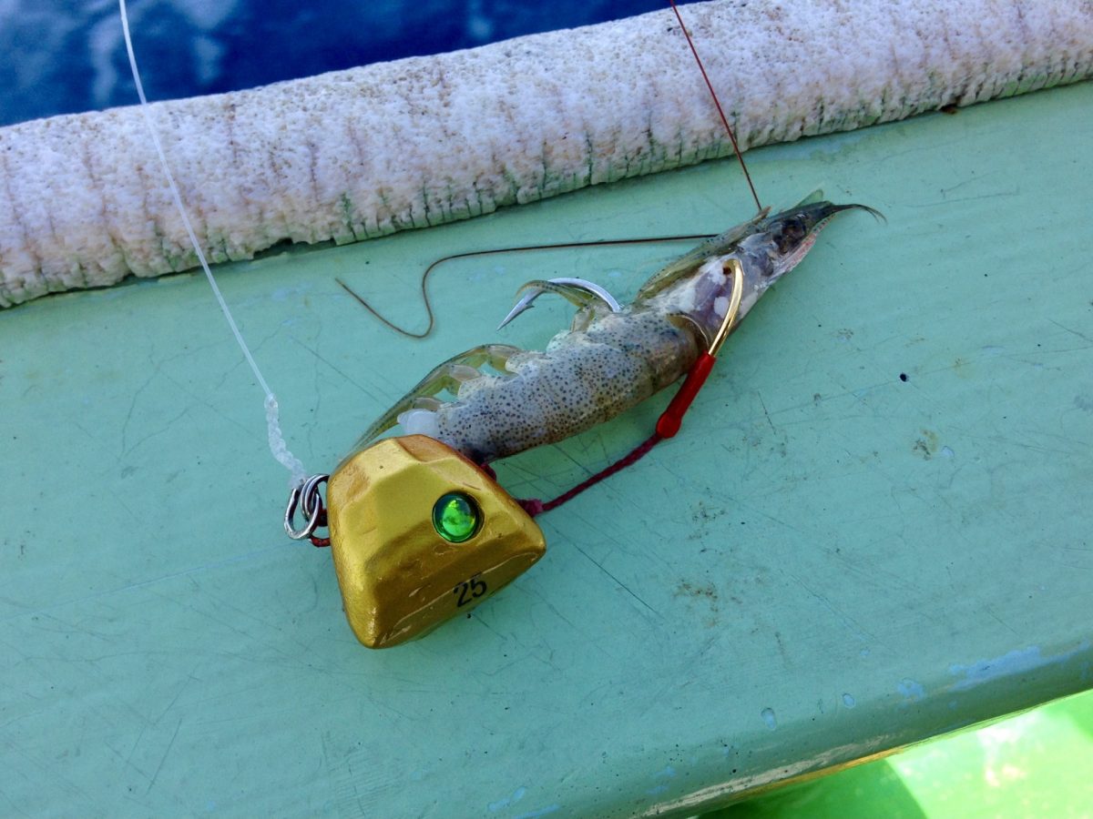 仕掛けにエサとなるエビを取り付け、着底するまで仕掛けを沈めたのち50㎝ほど底切り(仕掛けを海底から持ち上げること)してアタリを待つだけというシンプルな釣り方です。