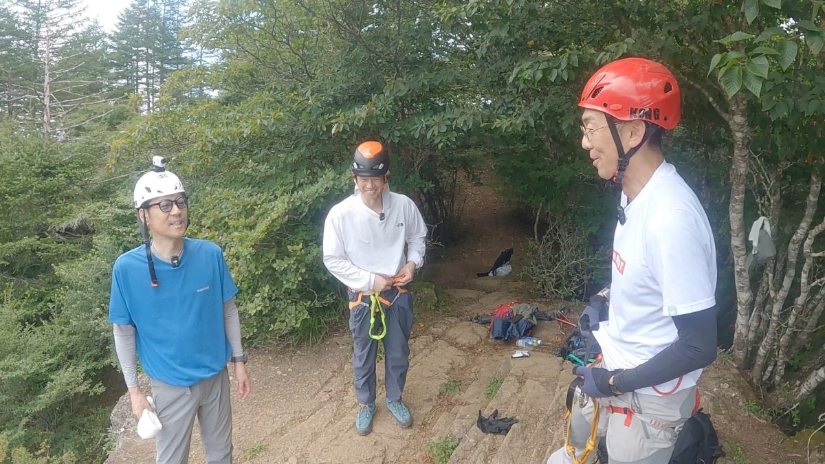 東野:収録前に低い山に行くんです。すると筋肉痛になり、その筋肉痛がとれ、それで本番! というのが調子いいので。でも今回は脚力より、高さへの恐怖心が問題で。事前にロープワークの練習に集まり、あーだこーだしゃべりながらやったので、まあいつもと変らずです。ときどき低レベルの話をしながら登るのがわれわれのスタイルで、安心して観ていただけるかと。それで下山したあとのお風呂が楽しかったり、だいたい焼肉を食べたりして毎回太って帰ってくるんですけど。