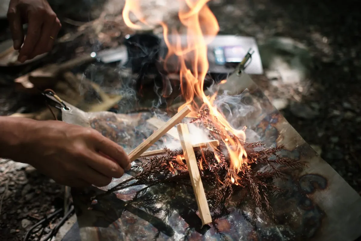 砂利や土のサイトなら、石や段差を避けて、揺すってもグラつかない位置を選びます。芝生やウッドデッキでは、必ず耐熱シートやプレートを敷き、その上に焚き火台を置きましょう。