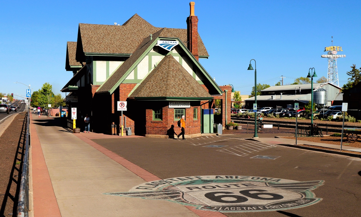 そして、フラッグスタッフはクルマと鉄道という二つの「移動の線」が交差する場所でもあります。長距離鉄道アムトラックが運行する「サウスウェスト・チーフ」の停車駅でもあるのです。駅のホームにはルート66のロゴが描かれています。