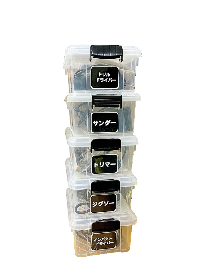 電動⼯具もしっかりそろっている。ただし、サンドペーパーやドリルビットなど消耗品系は⽤意する必要がある。