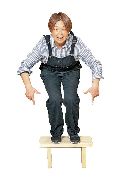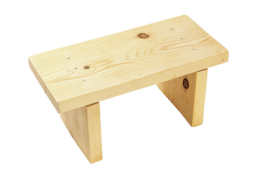 横約60×奥⾏約25×⾼さ約20㎝の踏み台を作る。天板と脚の板は⽊材カットサービス(有料)で時間を短縮。補強の貫(※)を天板に取り付けるためドリルで下⽳をあける。