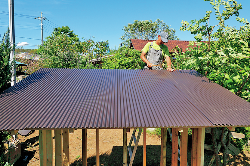 桁(前後の壁の一番上に載る横木)に垂木(屋根を支える材)を約45㎝間隔で渡し、その垂木と垂直に桟木(屋根材を固定する材)を打つ。屋根材は安価なトタン波板。それを専用釘で固定する。隣合う波板は2.5山以上重ねることで、雨水の浸入を防げる。