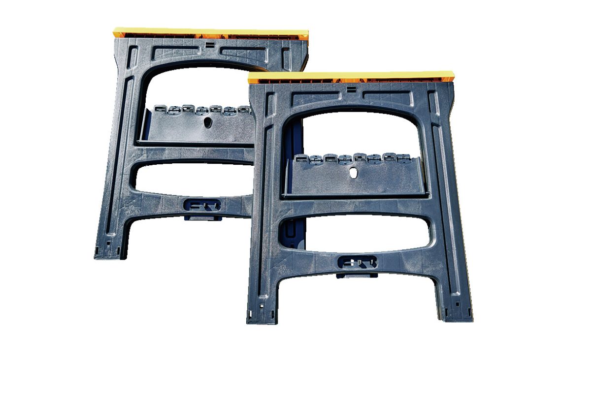 DIYや木工作などのシーンで活躍する、プラスチックの作業補助台脚。上部には滑り止めのゴムパーツ付属で、板がずれにくい。