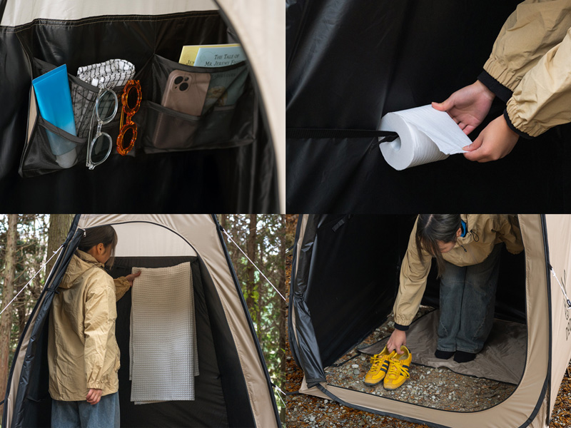 本体には一体式のフロアシートが縫い付けられており、タオルや服を掛けられるベルト、スマホや小物を入れるのに便利なポケット、さらにはトイレットペーパーを設置できる専用ベルトを装備。単なる目隠しに留まらず、中で過ごす時間の快適さにもこだわっている。