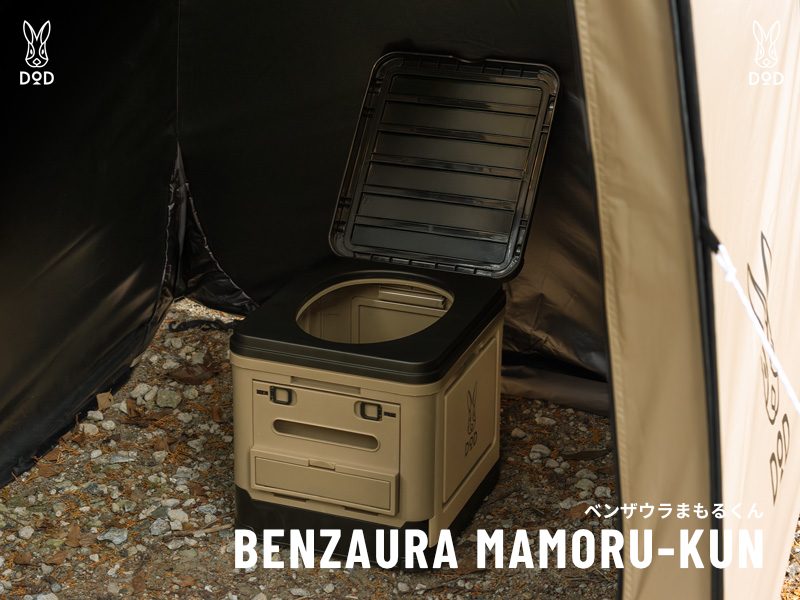 「ベンザウラまもるくん」がコンテナ型の折りたたみ式ポータブルトイレ。阪神・淡路大震災を経験したDODの防災士が、断水時の衛生管理の重要性を感じた実体験を元に開発している。