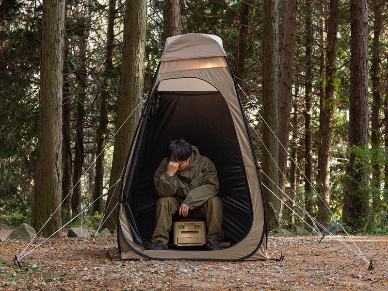 外遊びでもビーチや公園、テントサウナなどでは「人目が気になって着替えにくい」「近くに着替えられる場所がない」といった不便を感じるシーンは多い。タテテント壁面の肩から下の生地には、遮光率99.9%以上のブラックコーティング生地を使用。日中はもちろん、夜間にテント内でライトを使用しても体のシルエットが外からほとんど見えない。一方で、肩から上は光を取り込む非遮光生地でプライバシーは完全に守りながらも日中はテント内が真っ暗にならず、手元が見やすいという快適性を両立している。