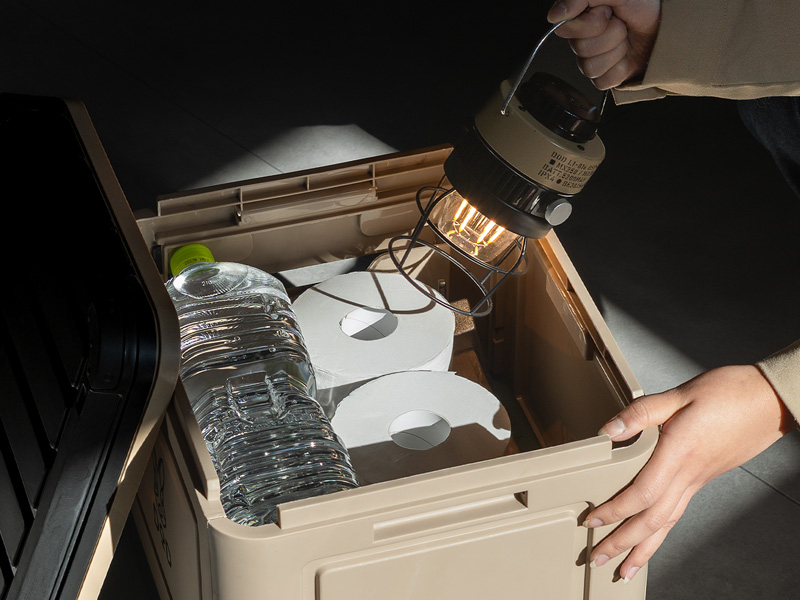 リビングやクローゼットに馴染むスタイリッシュなコンテナ構造を採用。使わないときには防災グッズやアウトドア用品を収納できるコンテナとしても活用できる。