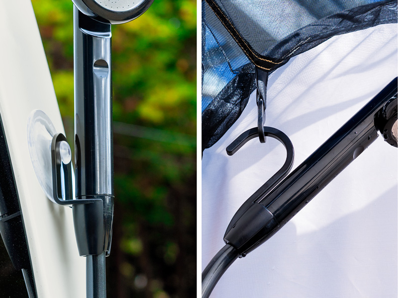 場所を選ばずシャワーが設置できるよう車のボディなどに固定できる「吸盤式」と、木やポールに吊るせる「フック式」の2種類のホルダーを標準装備。持ち運びに便利なキャリーバック付きで、キャンプのパッキングや防災時の持ち出しもスムーズにできそうだ。