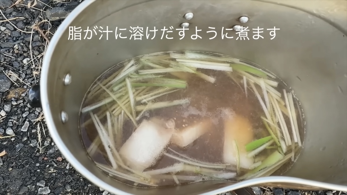 続いて、クマ鍋をつくっていきます。具だくさんのちゃんこ鍋風にしても良さそうですが、今回の主眼はクマ肉を味わうこと。主役のクマ肉を引き立たせる汁物代わりのお鍋ということで、あえて具材は肉と細切りのネギだけのシンプルなスタイルでいきます。