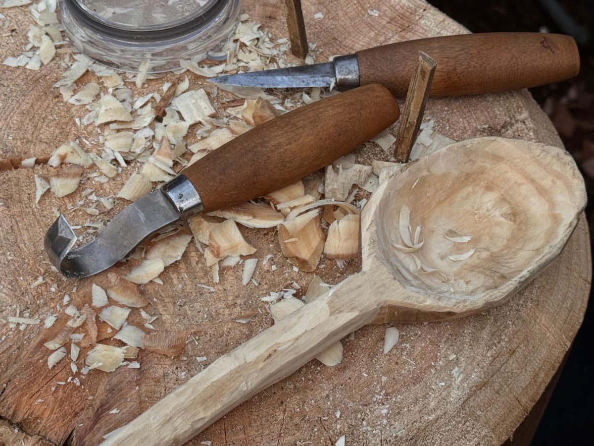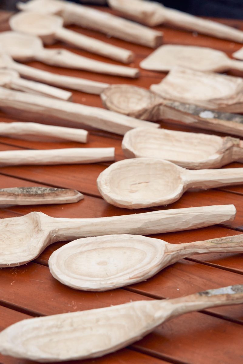 裏庭のホオノキを切り出し、好きなデザインで杓子を作っていく。