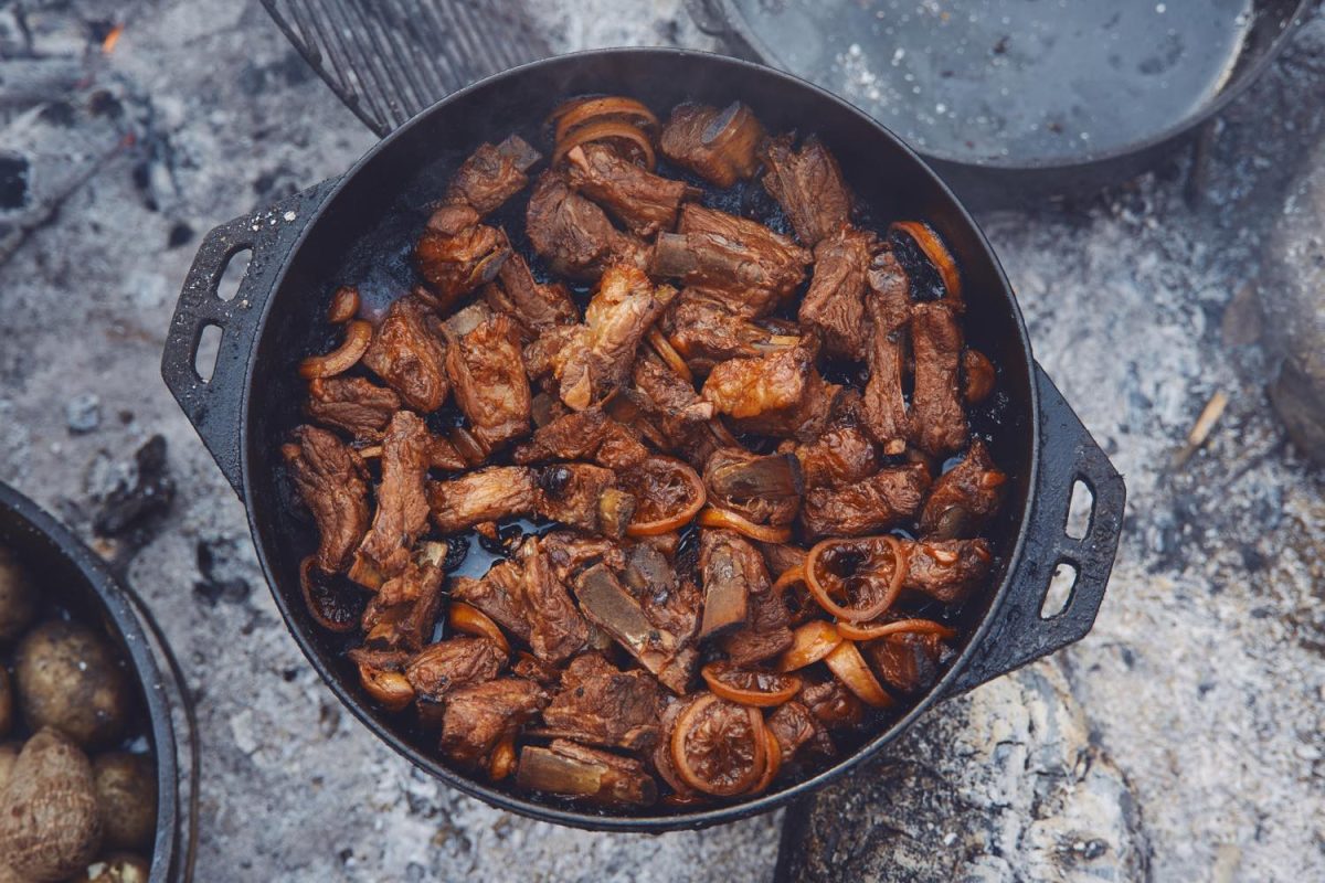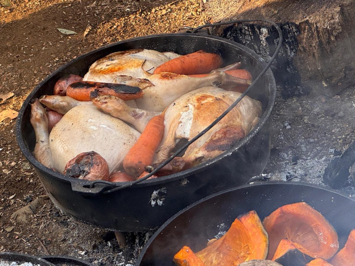 キャンプの大定番、ダッチオーブンに丸鶏と皮付き玉ねぎ、ニンジンを隙間なく詰め、熾火でじっくり焼き上げるローストチキン。少量のワインも入れておくのでふっくらジューシーで、焦げ付き防止にもなるという。