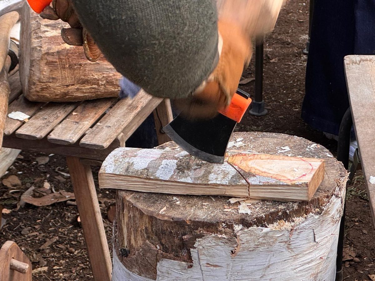くぼみができたら、アウトラインを切り取っていく。柄の部分は鉈を当てると簡単にまっすぐ割れるのだが、ストッパーとなる切り込みがないと割れすぎてしまう。