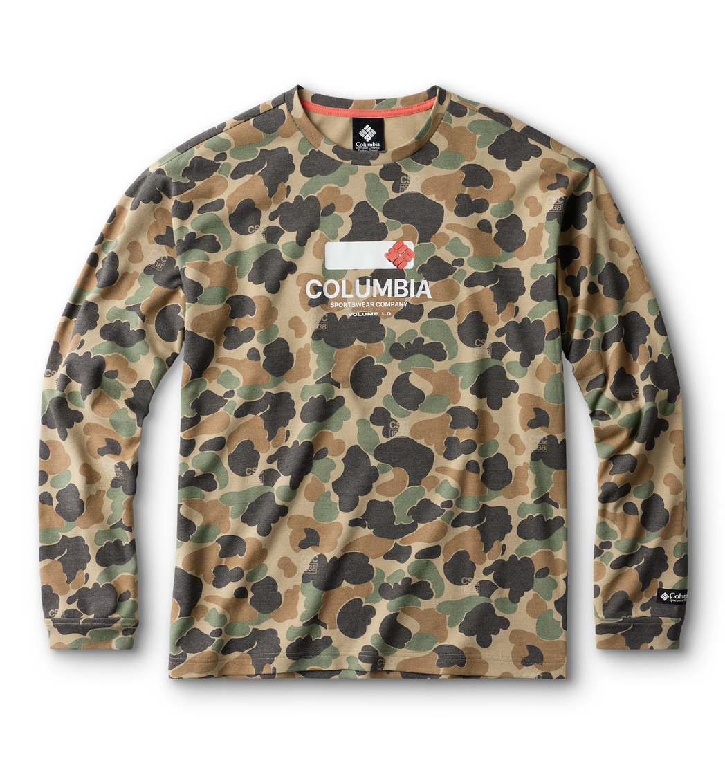 クラシックなコロンビアのハンティングギアから着想を得つつ、どんなシーンでも着用できる汎用性と存在感のあるスタイルにアップデートしたロングスリーブTシャツ。アーカイブのハンティングギアにインスパイアされたBritish Tan Duck Camoを全面にプリントしている。
