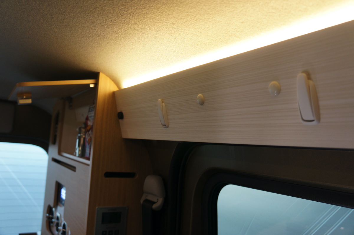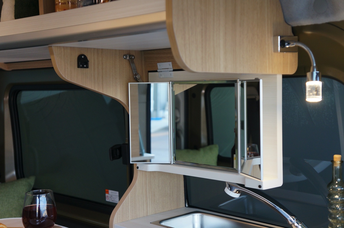 高品質の家具類やベッドに関しては好評だった先代からのものを基本的には継承。調光式のLED照明や間接照明、スポットライトなど照明類も充実しており、夜間もゆったりとくつろげるほか、プルダウン式のフリーBOXには3面鏡も備わっていてちょっとした身だしなみの確認ができるなど、軽自動車ベースとは思えない作り。