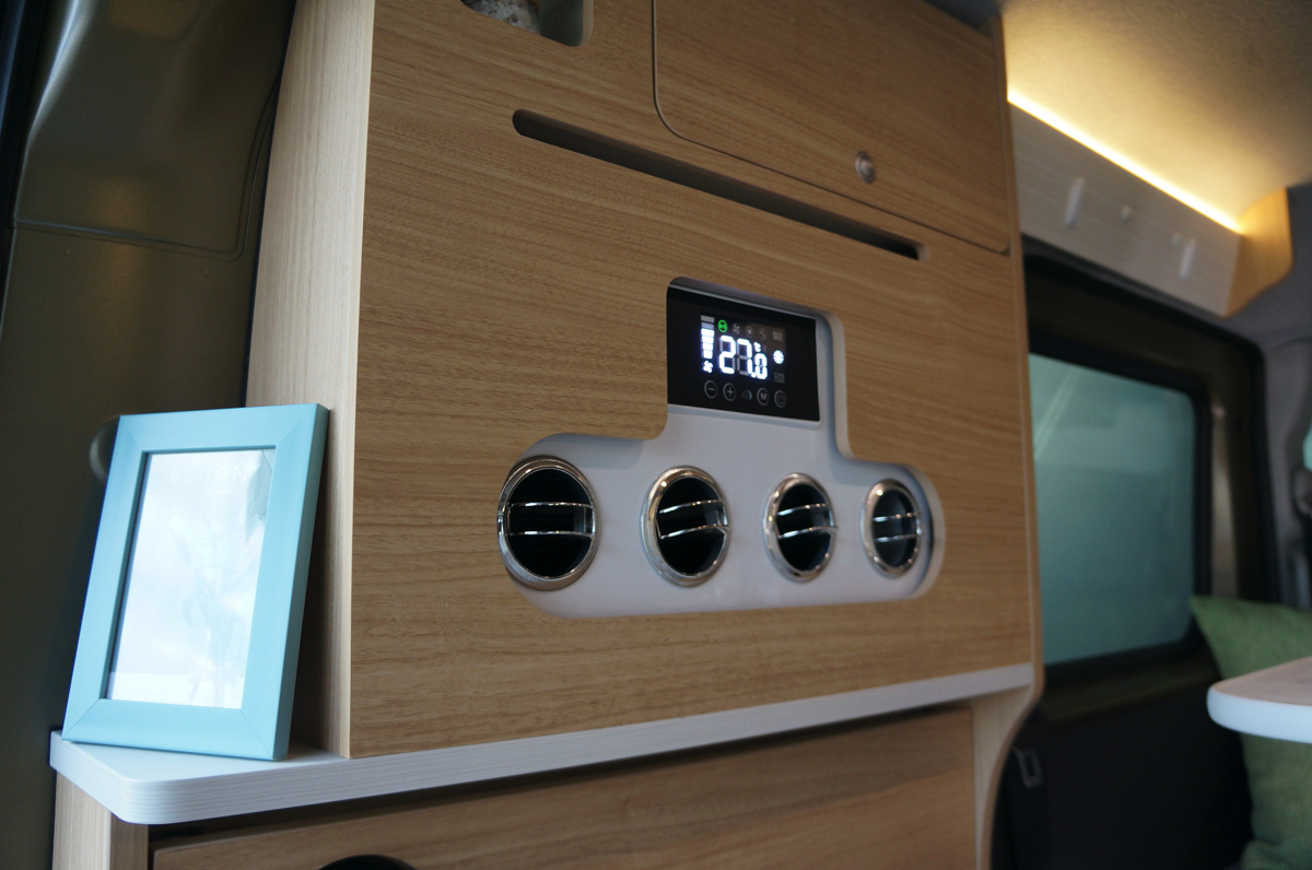 さらに、車中泊には欠かせない遮光カーテンをはじめ、車載用DC12Vクーラーに1500Wインバーター、おまけに200Ahリチウムイオンサブバッテリーが標準装備されている点が大きなポイント。こうした車載クーラーや鉛バッテリーではなくリチウムイオンバッテリーが軽キャンピングカーに標準装備されるようになったのもユーザーからの声が多かったのがその理由だとか。これら快適性を高めるために、クーラーの取り付け位置やバッテリーを置くスペースなど、試行錯誤を繰り返しつつ就寝スペースを犠牲にせず搭載できるのはやはり長年の経験からと感心しました。また、オプションでFFヒーターの装備も可能になっているので、季節を問わず車内で快適に過ごせるようになっています。