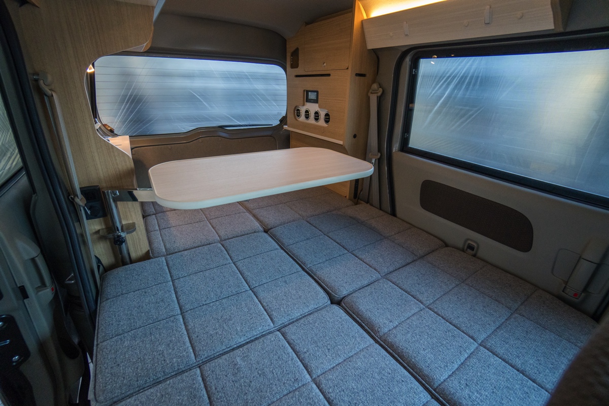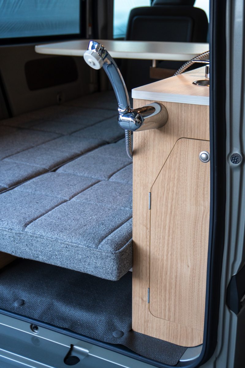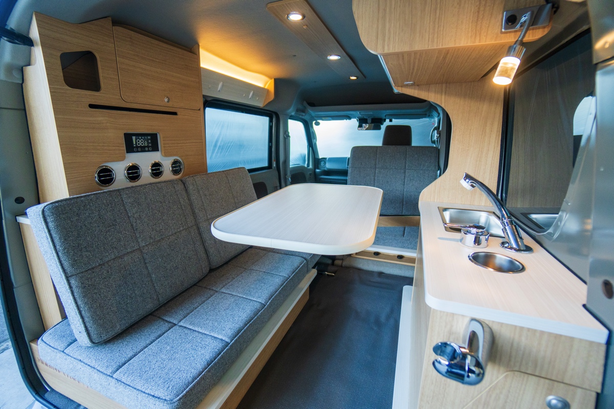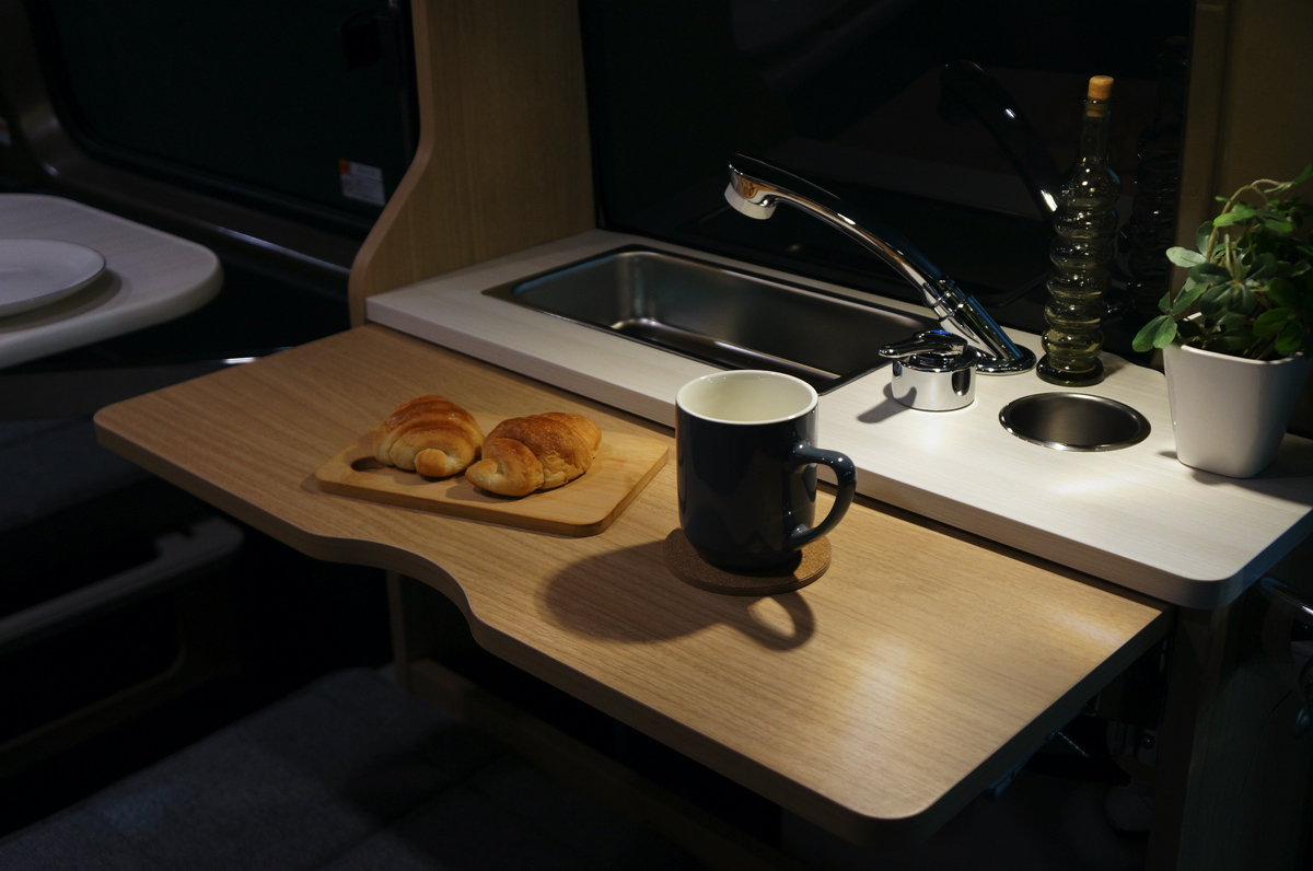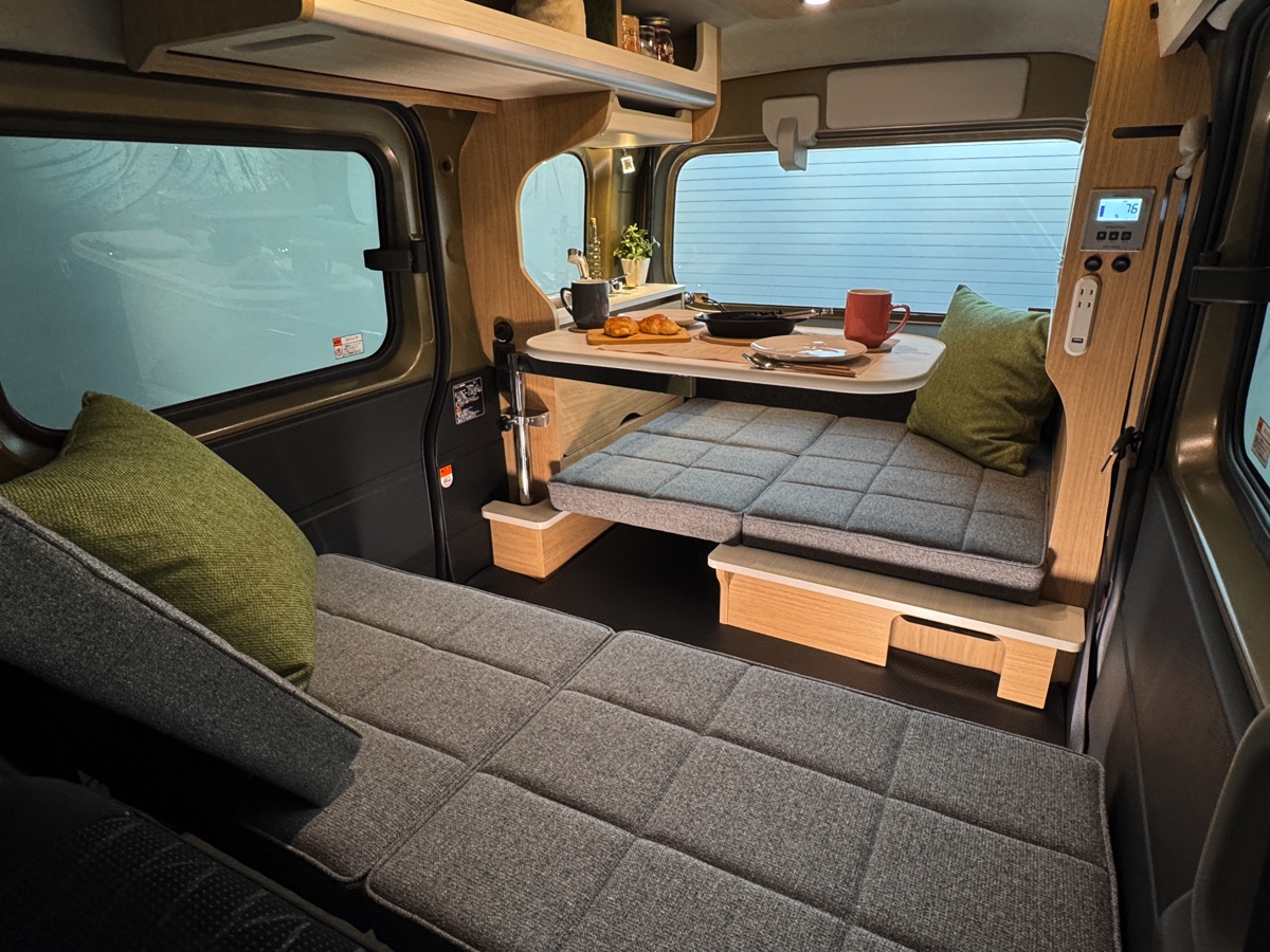 まずはレイアウトから。同社の姉妹モデル「ミニチュアボックス」でも採用されるマルチウェイテーブルを搭載し、好みの位置でテーブルが車内にセットできるほか、セカンドシートと荷室のベッドマットで対面のリビングに展開することができる設計。そして、ミニチュアボックスとは異なり天井や左右のリアクオーターウインドウには断熱施工がされているだけでなく、シンクや引き出しシャワー付きの蛇口などの水まわりも完備。