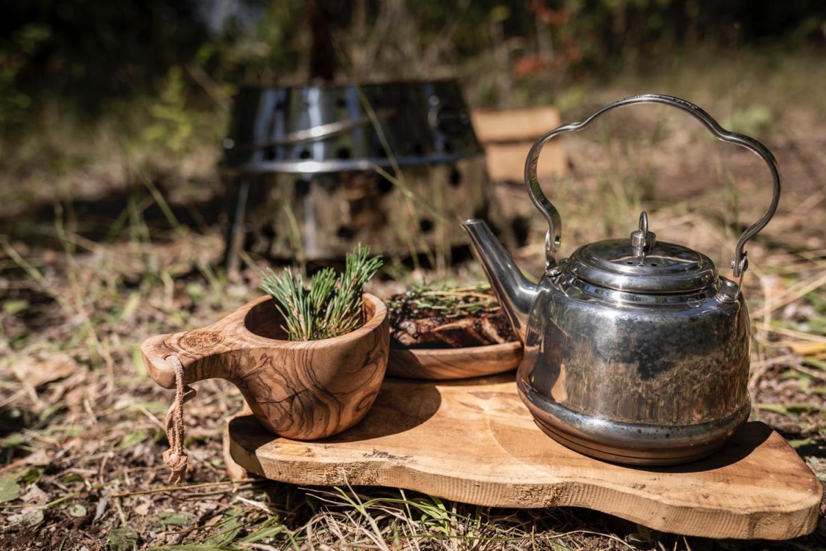 注ぎ口にふたが付いたケトルは中に灰やホコリが入り込みにくいため焚き火向き。