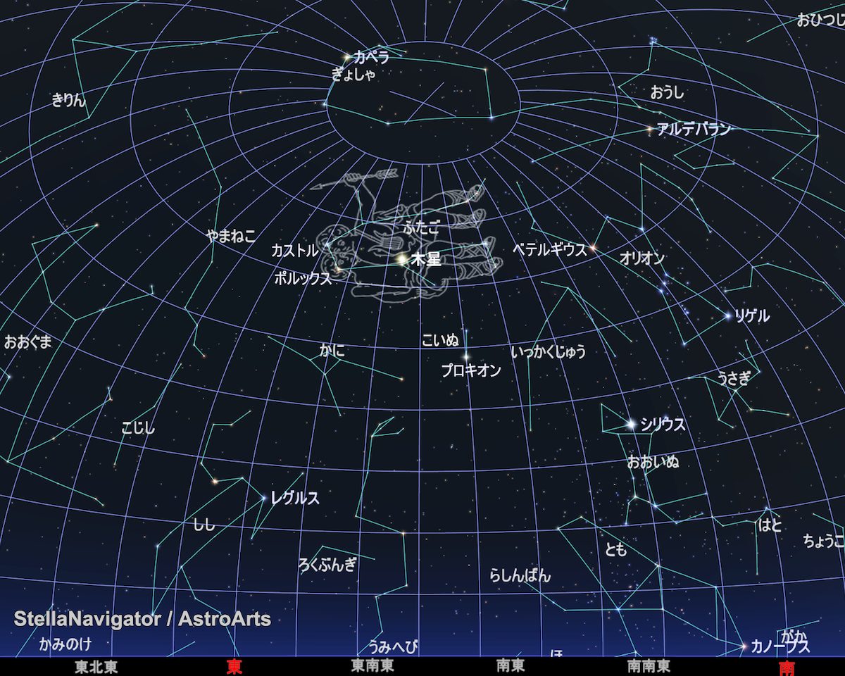 1月下旬の南の空。ふたご座が高く昇り、その近くに木星が光る。オリオン座やおおいぬ座のシリウスなど冬の星がにぎやかだ。(画像:ステラナビゲータ/アストロアーツ)