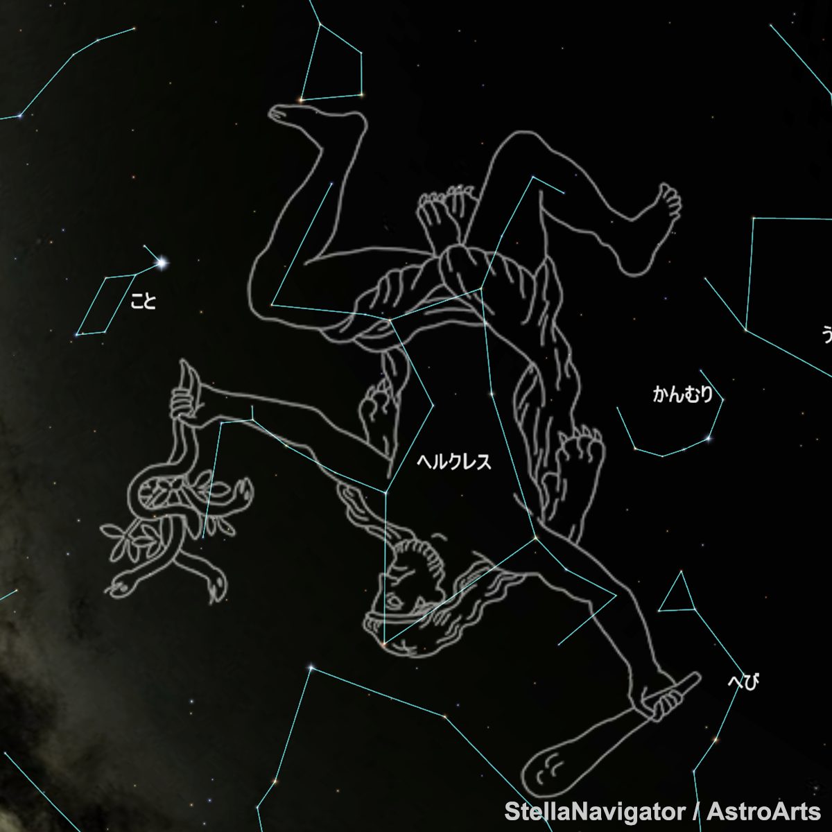 ヘルクレス座も棍棒を振りかざし、右手にかざすは蛇がからみつくりんごの木。(画像:ステラナビゲータ/アストロアーツ)