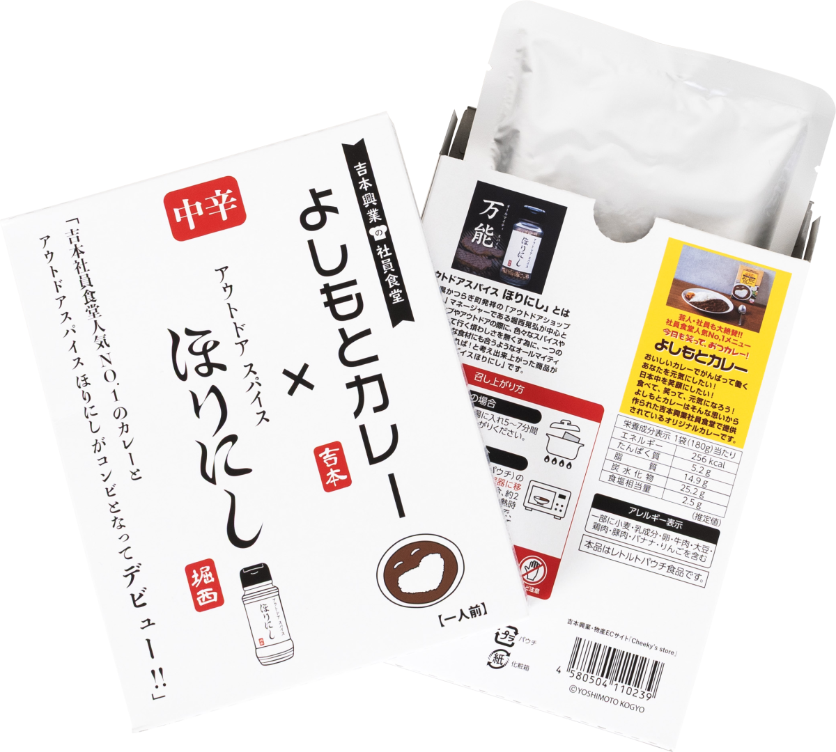 タッグを組んで販売されるのは「よしもとカレー×アウトドアスパイスほりにし 中辛」というレトルトカレー。一体どんな商品なのか、さっそくチェックしてみよう。