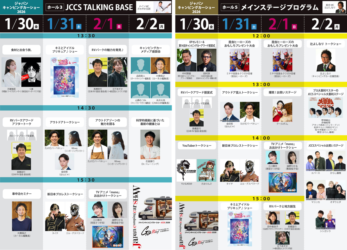 1月30日(金)は第14回キャンピングカーアワードに選ばれた中村獅童さんと昨年受賞した田村 淳さんのトークショーに加え、中村獅童さんの愛車の展示。また、31日(土)にはアウトドア好きで知られるたけだバーベキューさんと金田哲さん(はんにゃ)のトークショーや「キミとアイドルプリキュア♪ショー」、2月1日(日)はキャピングカーオーナーとなったお笑い芸人のクールポコのステージをはじめ、TVアニメ「mono」のお出演声優による出かけトークショーを開催。そして最終日となる2月2日(月)は野澤輸出、赤嶺総理、アタック西本(ジェラードン)、松井ケムリ(令和ロマン)、佐々木隆史(エバース)、青空(からし蓮根)といった人気お笑い芸人による大喜利ステージに加え、エバース、からし蓮根、マユリカ、オダウエダ、シシガシラのお笑いステージも用意し、イベントを盛り上げてくれます。
