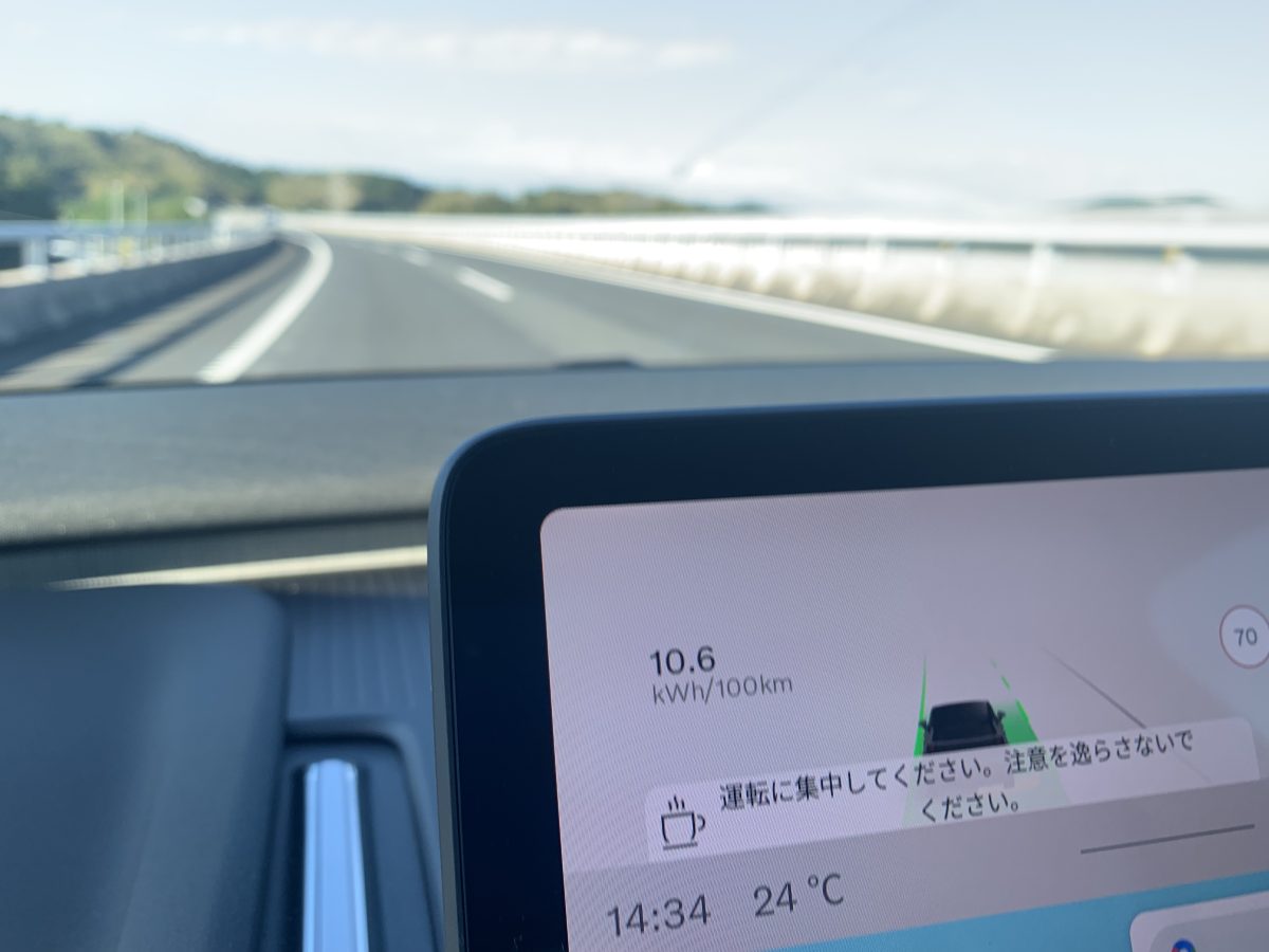 東京からここまで走ってきた間はリアモーターだけでしたが、まったく不満は感じませんでした。スムーズで力強い、EVならではのモーターによる加速を十分以上に感じていました。京都から走った時と違って、2名乗車でしたが、その重量増による加速の鈍化などもまったくありません。