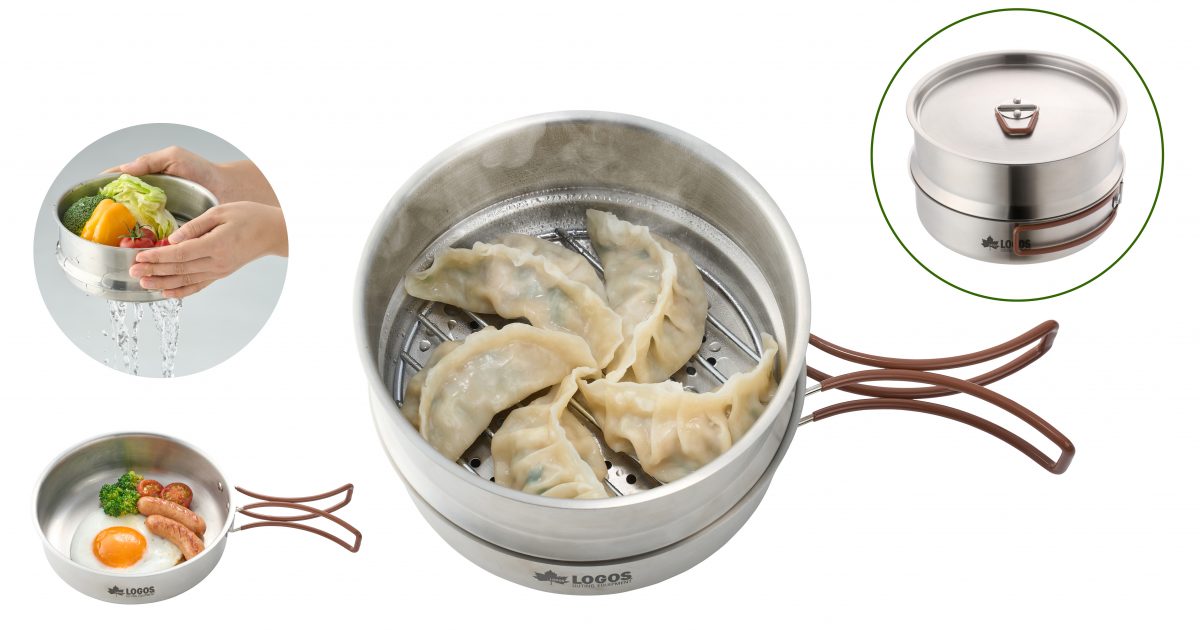蒸し器、フライパン(浅鍋)、水切りザルの3役をこなすクッカーセット。スタックが可能で取手も折りたためるコンパクト構造のため、持ち運びや保管にも便利だ。