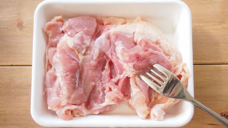 1.鶏もも肉の両面に、フォークで穴を開ける。
