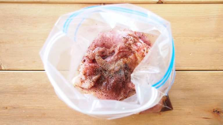 2.保存袋に鶏肉と、下味調味料の食材を入れて揉み込む。漬け込み用のニンニクは、すりおろしてから入れる。
