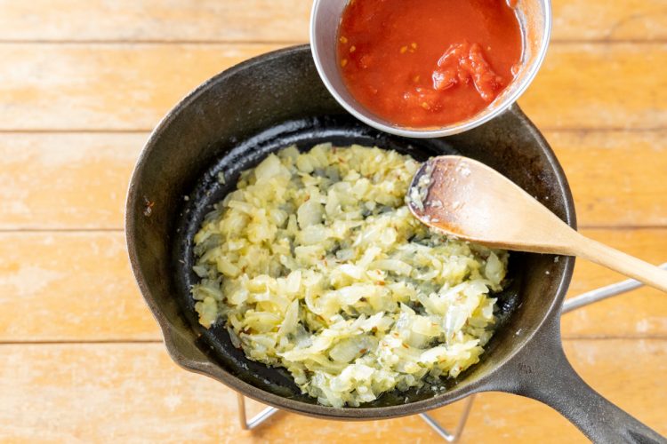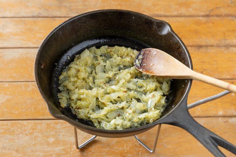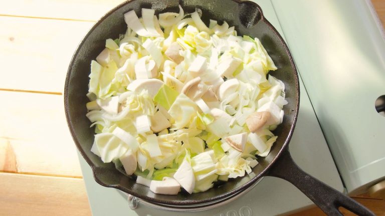 10.ざく切りにしたキャベツ、エリンギ、長ネギをスキレットに入れて炒める。