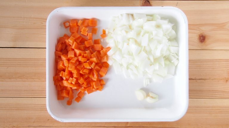 1.玉ねぎと人参は粗くみじん切りにする。にんにくは皮をむいて半割りにする。