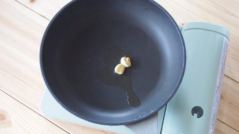 2.鍋にオリーブオイルとにんにくを入れて、弱火で加熱する。