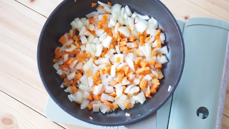 3.にんにくがきつね色になってきたら、玉ねぎと人参を加えて弱火で炒める。
