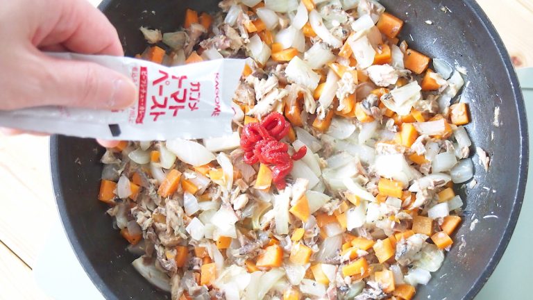 4.野菜がしんなりしてきたら、鯖缶を汁ごと入れて炒める。