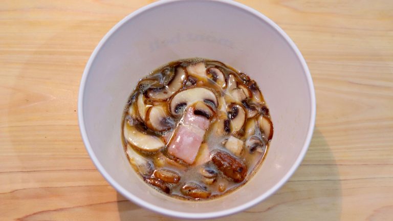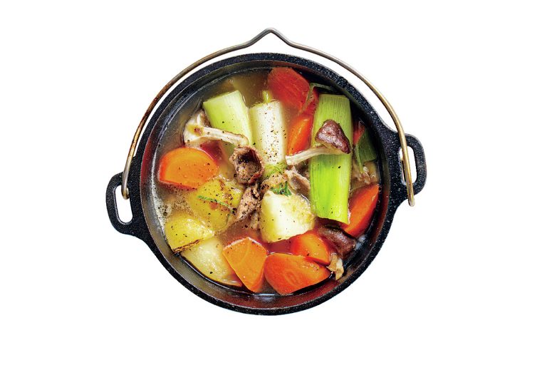 - 水とローリエを加えて煮立て、アクを取り除いたら長ネギとしいたけを加え、具材がやわらかくなるまで煮込む。