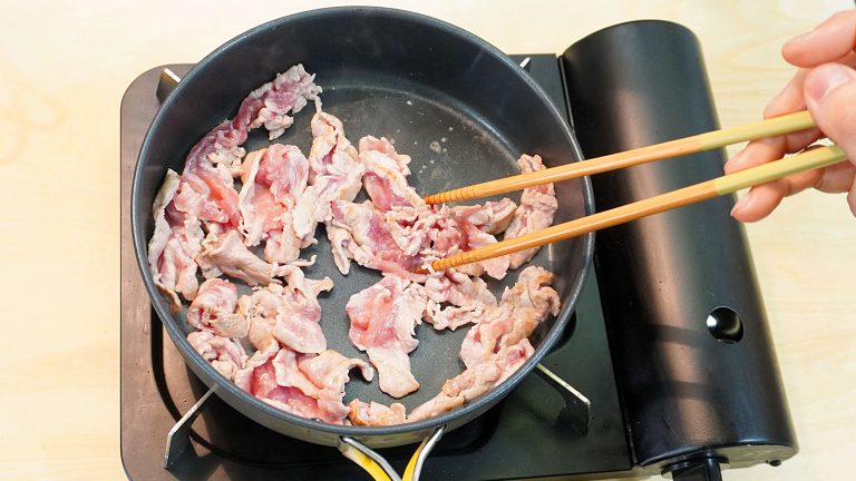 10.肉の表面が白っぽくなってきたら、ソースを作る。