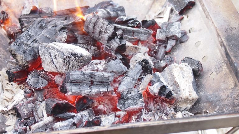 6.火が燃え上がった状態では、温度が高すぎてしまうため、焚き火料理は熾火の状態にしてから調理をする。薪が黒っぽくなり、燃え上がる火が落ち着いた状態に調整しよう。