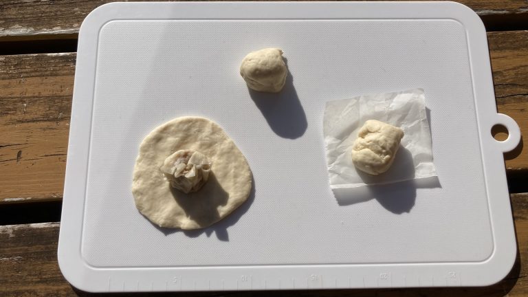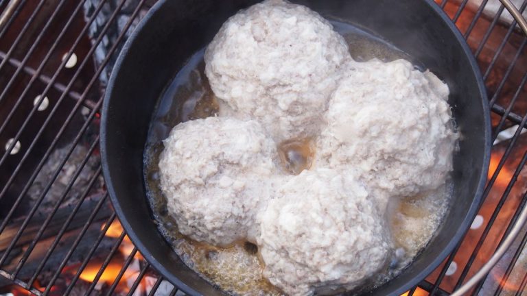 8.ハンバーグの生地を4等分にして丸めたら、ダッチオーブンに並べる。