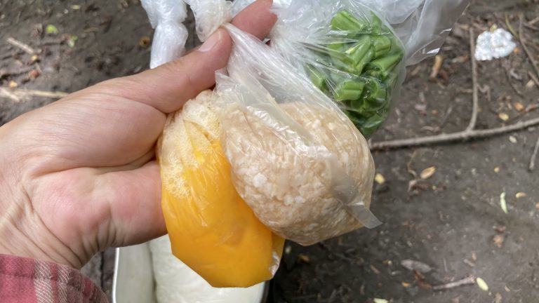 無洗米1合分をジップロックに入れる。無洗米でない場合は、水にさらしてからジップロックに入れる。カニカマは袋に入ったまま持っていっても大丈夫。必要な分だけラップに包んでジップロックに入れて持っていくのも良い。具材は冷やした状態で現地へ持っていこう。