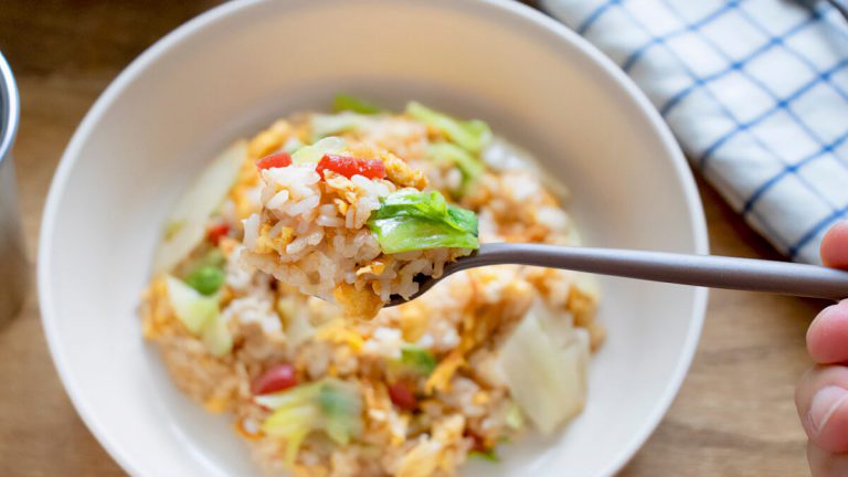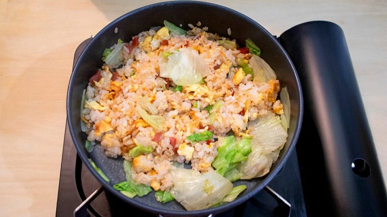11.野菜がしんなりしてきたら、ご飯を入れて混ぜ合わせる。